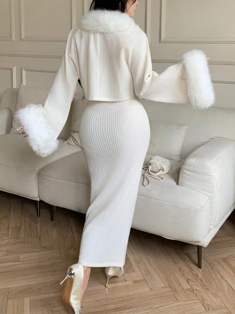 2pcs Set: White Faux Fur Trim Jacket + Fitted Long Skirt | Women'S | Luxurious Vintage Party-Inspired Design, Perfect for Dinners, Winter Parties, and Fall/Winter Occasions