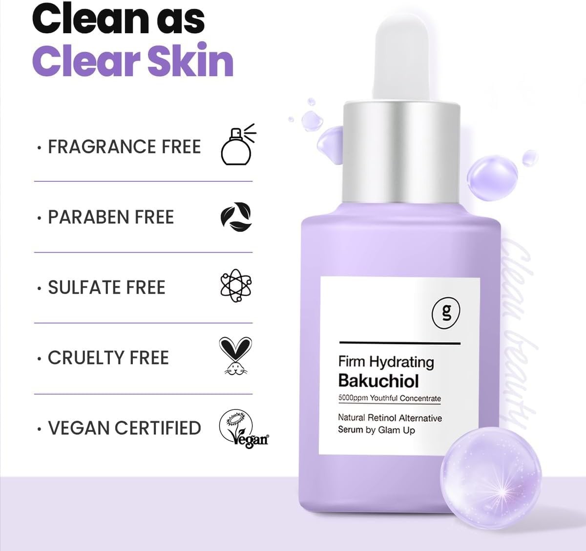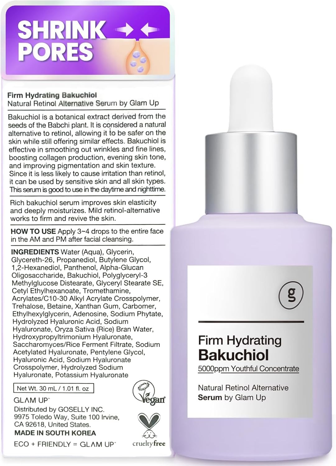 Glam Up Bakuchiol Serum & Hyaluronic Acid - Anti-Aging Retinol Alternative Serum, Blur Fine Lines, Anti-Wrinkles, Pore shrink and Soothing Pimples, Hydrate Facial Skin, Cruelty-Free (1.01 Fl Oz)